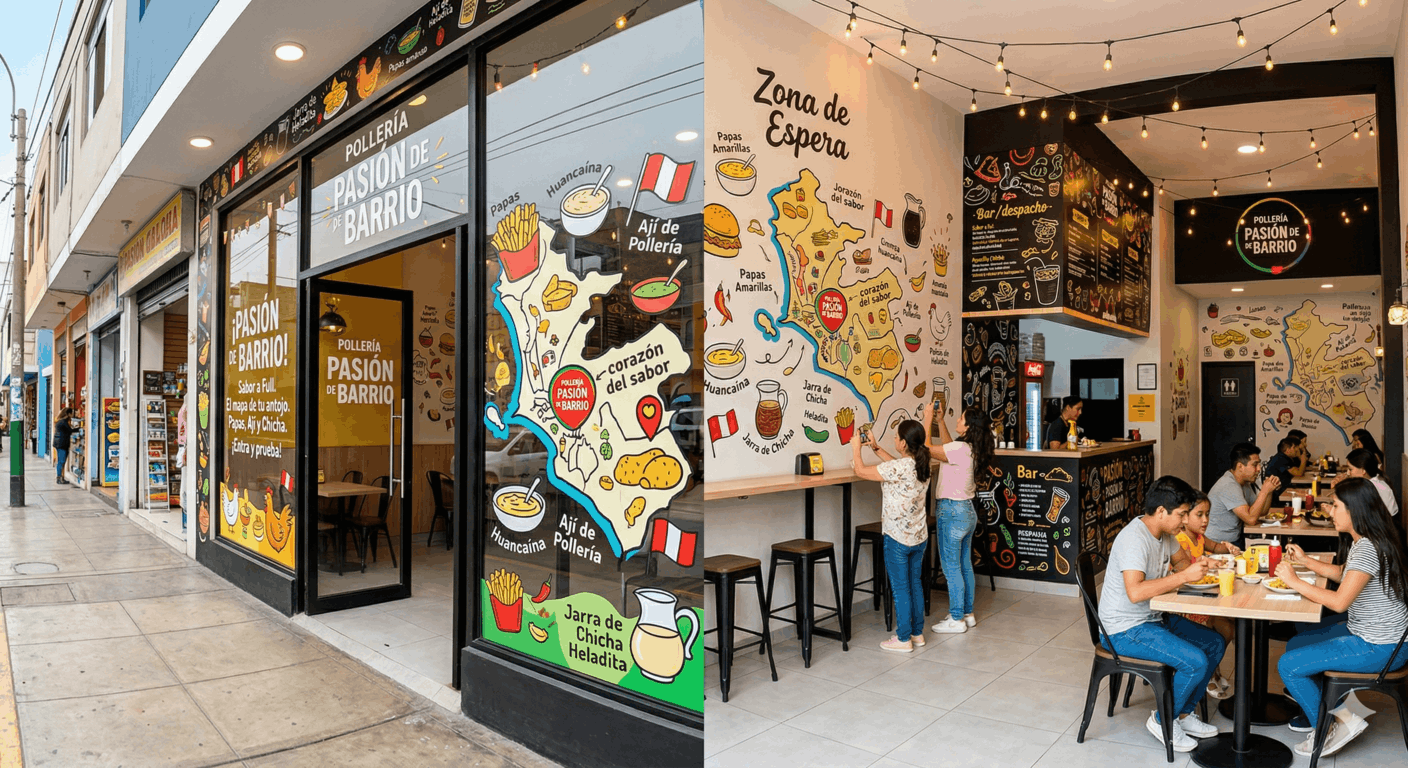 Para el Reconocimiento Icónico: Un pollo a la brasa estilizado o una silueta de horno de leña se identifican al toque. Son símbolos que gritan «tradición peruana» en cada rincón de la pared.