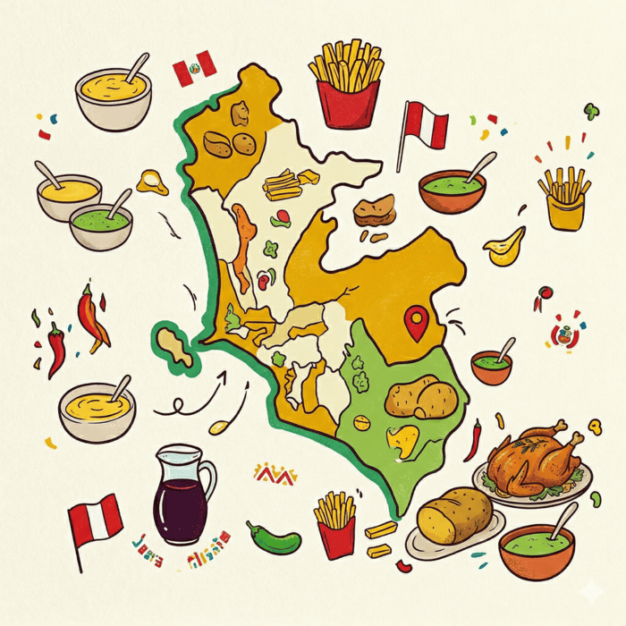 Elemento central: Un mapa creativo de Lima o del distrito, donde el punto central es tu pollería, rodeado de iconos divertidos de papas amarillas, cremas y una jarra de chicha heladita.