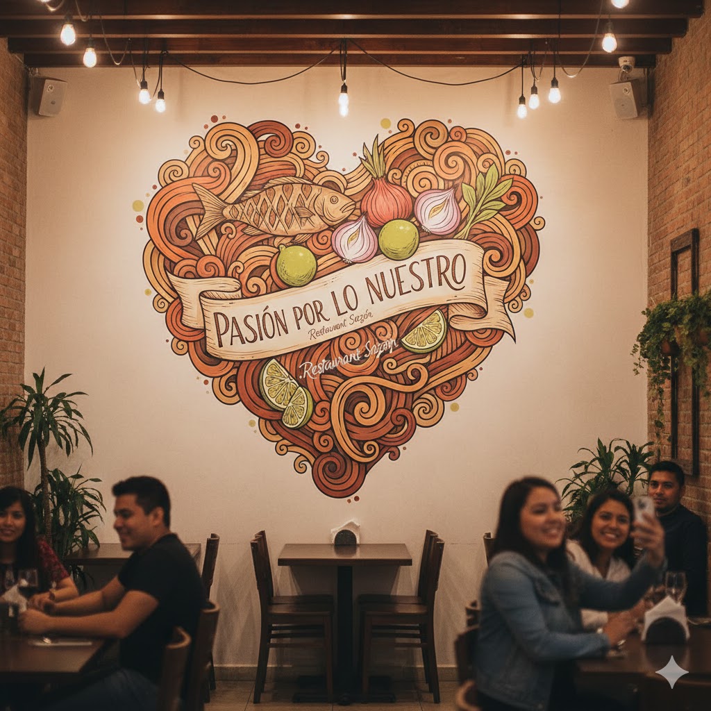 Tipografía: Una fuente manual, como escrita con tiza, que diga «Pasión por lo nuestro» o el nombre de tu restaurante.