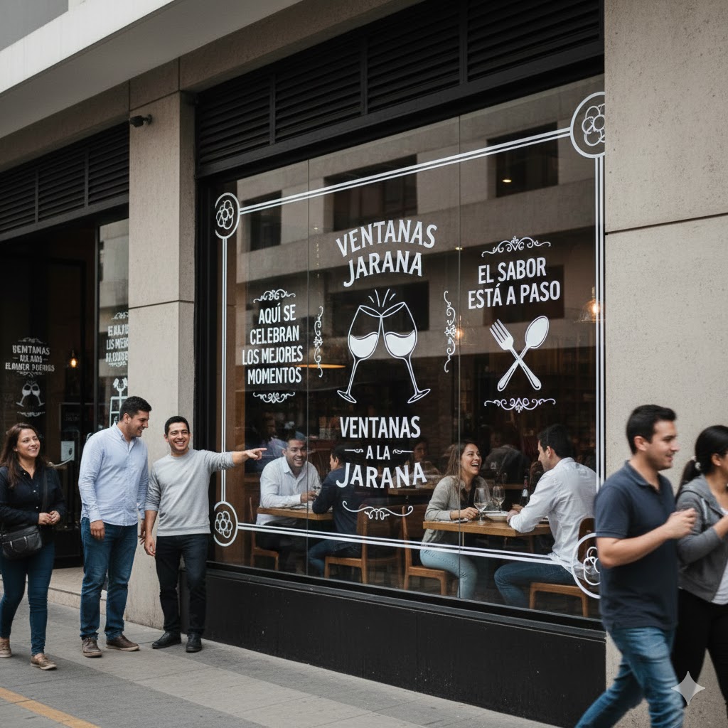 Para que tu diseño no se vea plano como cartulina, aplica la técnica de superposición de capas. Coloca un vinilo esmerilado de base en los cristales y, encima, pega elementos de color o letras con relieve. Esto crea un efecto visual de 3D que captura la atención y le da un toque de «restaurante de lujo» sin que te cueste un ojo de la cara. ¡La profundidad es la clave para que tu fachada resalte en toda la cuadra!